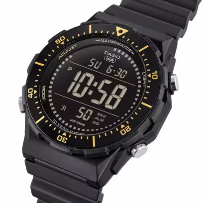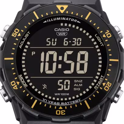 A multifunctional digital watch with wide, easy-read display and rotating bezel — perfect for the sports scene. Water-resistant up to 100 meters, ten-year battery life, LED backlight, as well as handy features like stopwatch, alarm, and more.