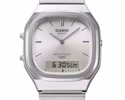 Give your retro style a modern twist, or your contemporary fashion a vintage touch. Either way you go, the refined and flowy AQ-240E strikes the right chord. The analog-digital AQ-240 with dual display goes retro-modern. With a slightly rectangular face offset by a gently rounded case and soft metal curves, this watch exudes sophistication. The sun-ray finish on the dial catches the light with a lustrous glow. Metallic indexes that blend a vintage feel with a modern aesthetic add another eye-catching touch. The digital LCD at the 6 o’clock position offers outstanding readability while maintaining a harmonious overall design, creating a timepiece that’s both functional and beautiful.