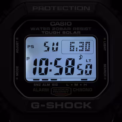 These Tough Solar models provide a choice of either the original G-5600 G-SHOCK design or the G-6900 design that is so popular among followers of today’s street fashions. The Tough Solar system, which is equipped without changing the basic design of the watches, makes it possible to generate enough power to keep the watch running with minimal exposure to normal lighting. The simple designs of these watches were achieved by eliminating as much coloring and decoration as possible.