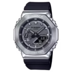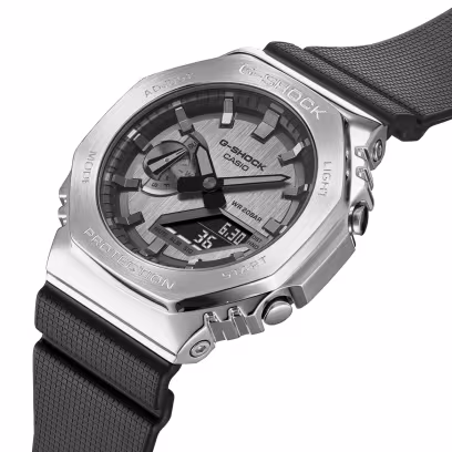Go sleek, sharp and bold with a G-SHOCK standard-bearer in a metal-clad octagonal take on the original iconic design. Forged in stainless steel with rounded hairline finish, the strong bezel says super style all the way. The dial is treated with vapor deposition finish for a meticulously detailed metallic look that suits a classic metal G-SHOCK timepiece. Incremental variations in the detailed square dot texturing on the wristband take casual urethane materials up a notch. Choose your statement in silver, blue, gray, or gray and red.
