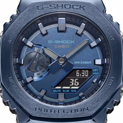 Go sleek, sharp and bold with a G-SHOCK standard-bearer in a metal-clad octagonal take on the original iconic design. Forged in stainless steel with rounded hairline finish, the strong bezel says super style all the way. The dial is treated with vapor deposition finish for a meticulously detailed metallic look that suits a classic metal G-SHOCK timepiece. Incremental variations in the detailed square dot texturing on the wristband take casual urethane materials up a notch. Choose your statement in silver, blue, gray, or gray and red.