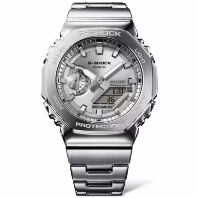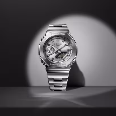 Introducing the GM-2110D — an analog-digital combination G-STEEL based on the GA-2100, now with a stylish metal bezel and band update. Meticulously forged and polished, the uniform octagonal stainless-steel bezel anchors a simple, no-fuss design with a sophisticated, yet tough look. Made of high-rigidity glass-fiber-reinforced fine resin, the case is the slimmest of all G-SHOCK combination models, at just 11.8 mm. The metal band, together with a pop of fresh color from the metallic brass dial, is up for anything — work or play. Choose from, sky blue, orange, or lime green, in addition to classic hues of navy and silver. All with high-brightness double LED light, ensuring an easy read even in the dark.